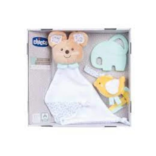 Carinissimo set regalo per nascita di Chicco, con un simpatico Doudou e due giochini da culla per allietare i riposini, il gioco e le ninne del neonato!